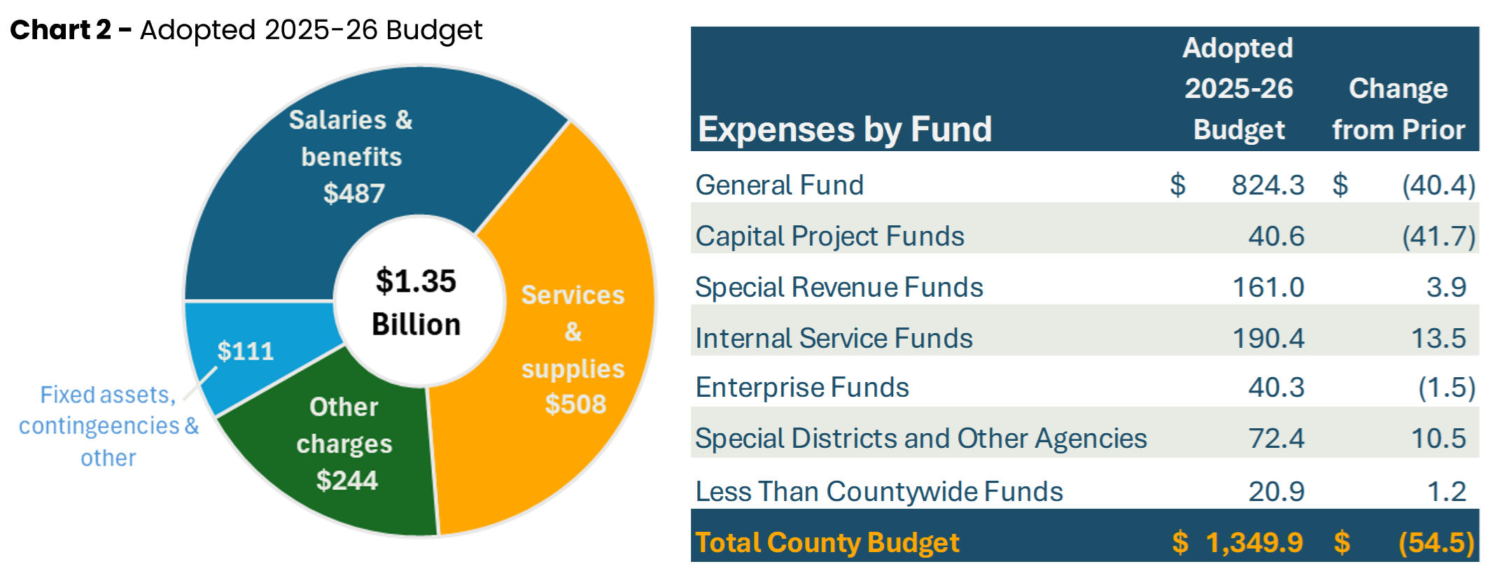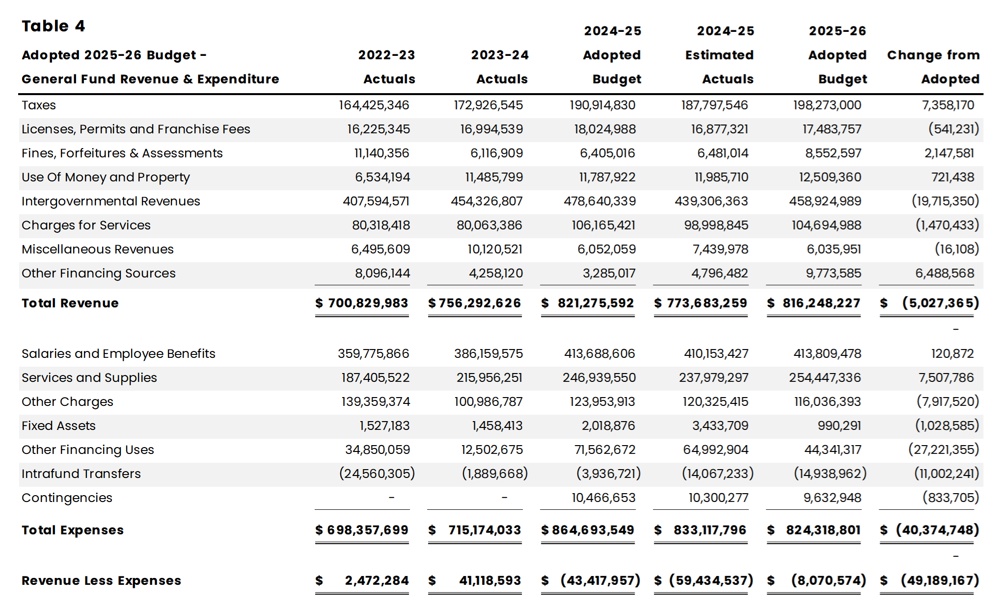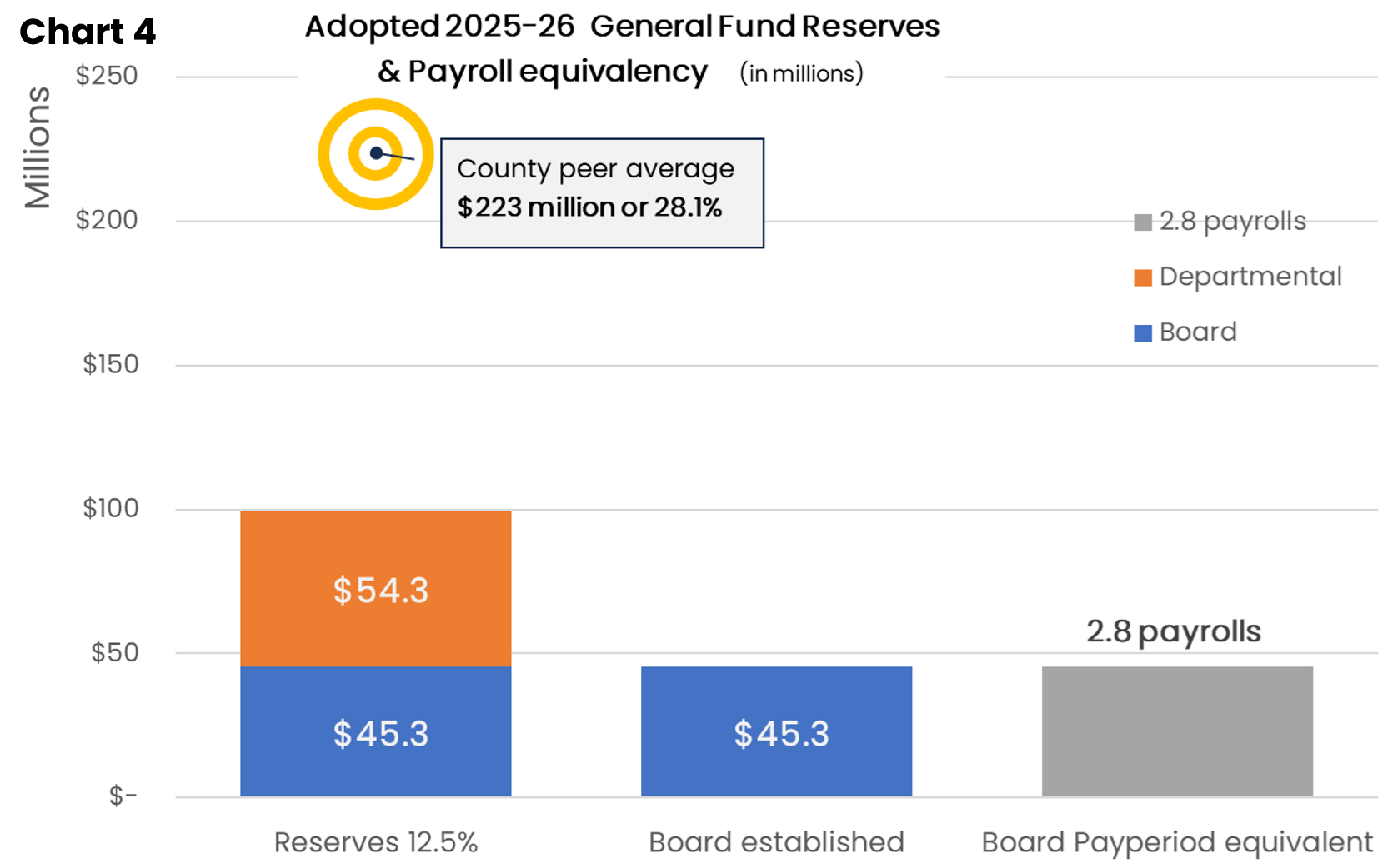 The largest fund included in the County budget was the General Fund. The 2025-26 General Fund Budget was balanced with $824.3 million in expenses, $816.3 million in revenues and $8.1 million in planned carryover of prior year fund balance. The budget maintained General Fund reserves at 12.5% or $99.6 million, but below the 15% target and the 28% peer average.