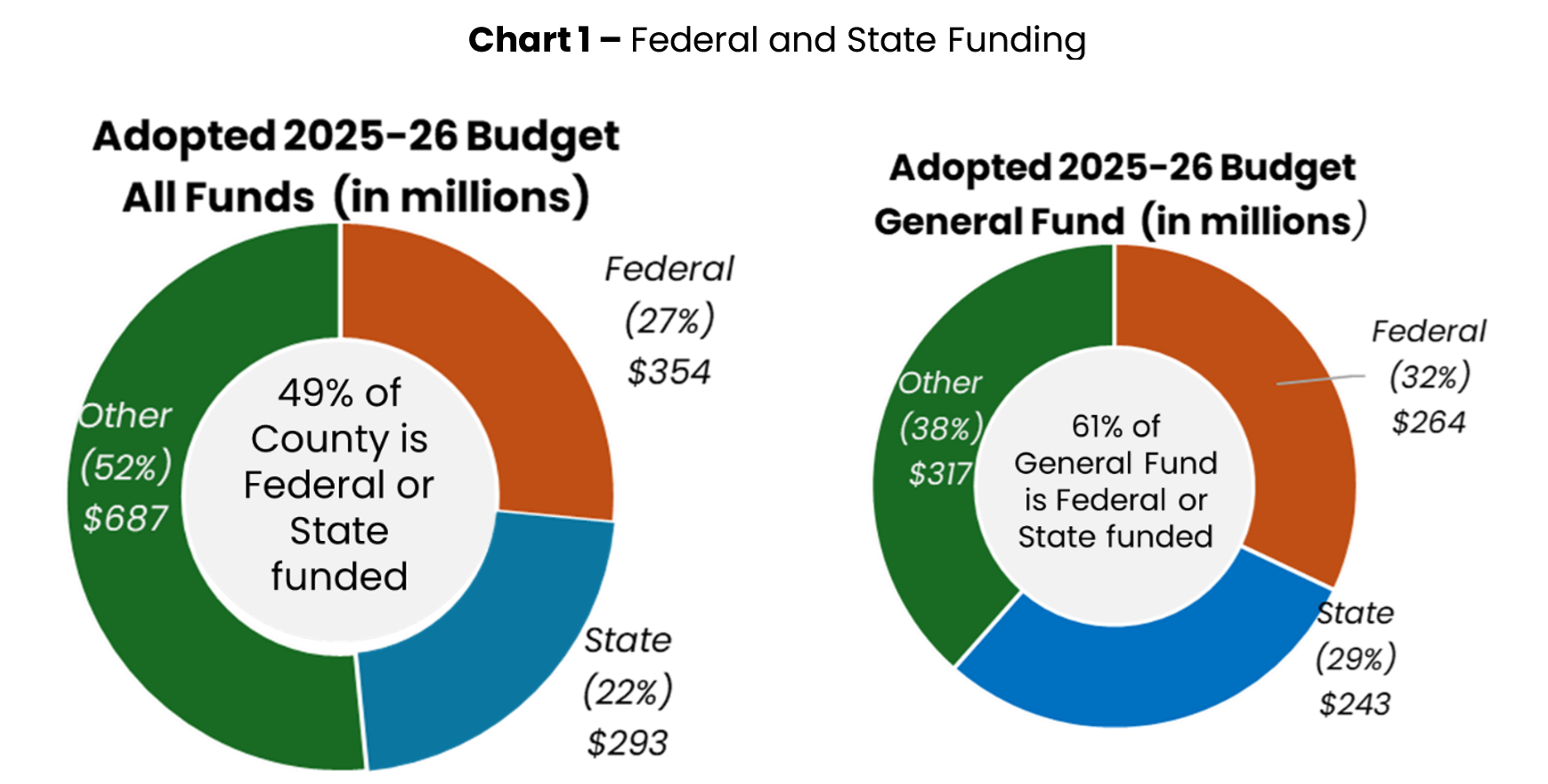In response, this budget prioritized mandated services, protected essential programs, and made strategic investments in the County’s future. And although it was presented amid the aforementioned headwinds, it did not yet reflect any significant budget impacts from changes in federal policy. The County’s exposure to federal funding and policy risk was significant as nearly half of the budget and 61% of the General Fund Budget is funded with federal and state revenue as shown in Chart 1.