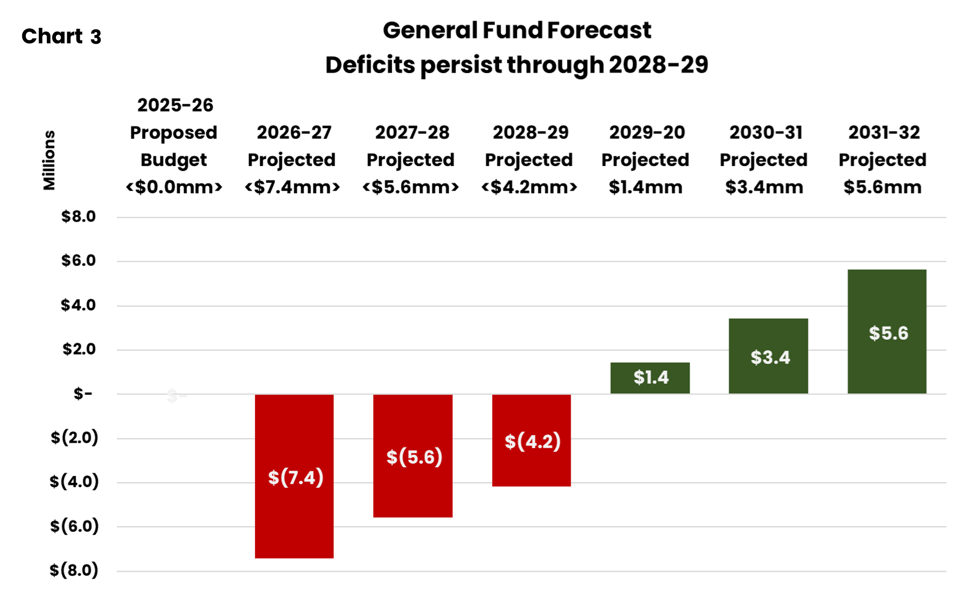 The largest fund included in the County budget was the General Fund. The 2025-26 General Fund Budget was balanced with $824.3 million in expenses, $816.3 million in revenues and $8.1 million in planned carryover of prior year fund balance. The budget maintained General Fund reserves at 12.5% or $99.6 million, but below the 15% target and the 28% peer average.