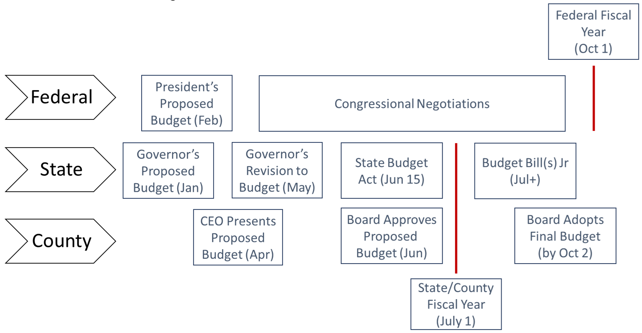 The image below illustrated the County’s budget timelines as compared to the Federal and State budget timelines.