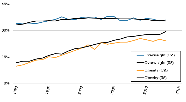 Trended local data not available, however, Santa Cruz County overweight and obesity rates, in general, track closely to the rates in California and the United States, though a substantial ethnic disparity extists between white adults (20.7%) and Hispanic adults
